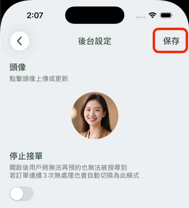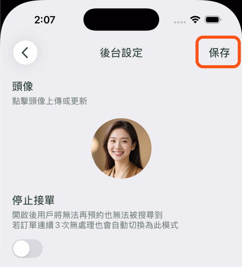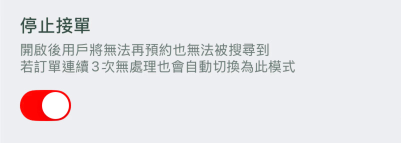 開啟「停止接單」後,用戶將無法搜尋到您。若暫時無法接單,可使用此功能暫停接單。