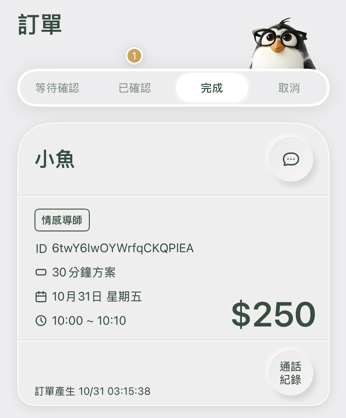 當目前時間超過訂單結束時間時,系統將自動轉為完成。若還在與用戶通話,系統不會強制將電話切斷,由老師決定通話是否繼續。 - 已取消:由用戶、老師或客服取消。