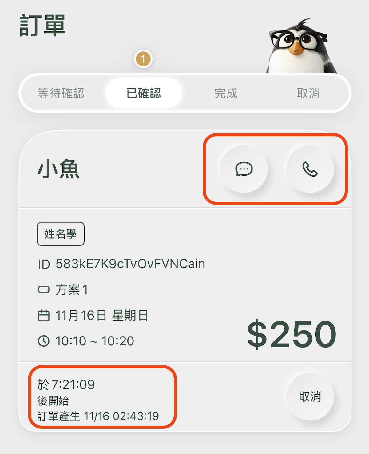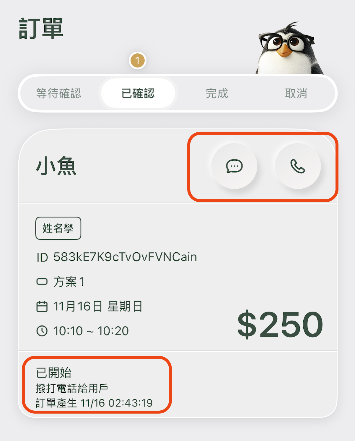 - 訂單開始時,老師端需主動於「已確認」訂單中,透過 「通話」或「訊息」 功能與用戶聯繫並開始服務。