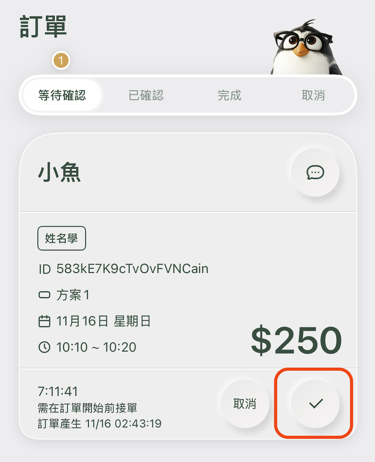 - 訂單由老師確認前,用戶可自行取消。