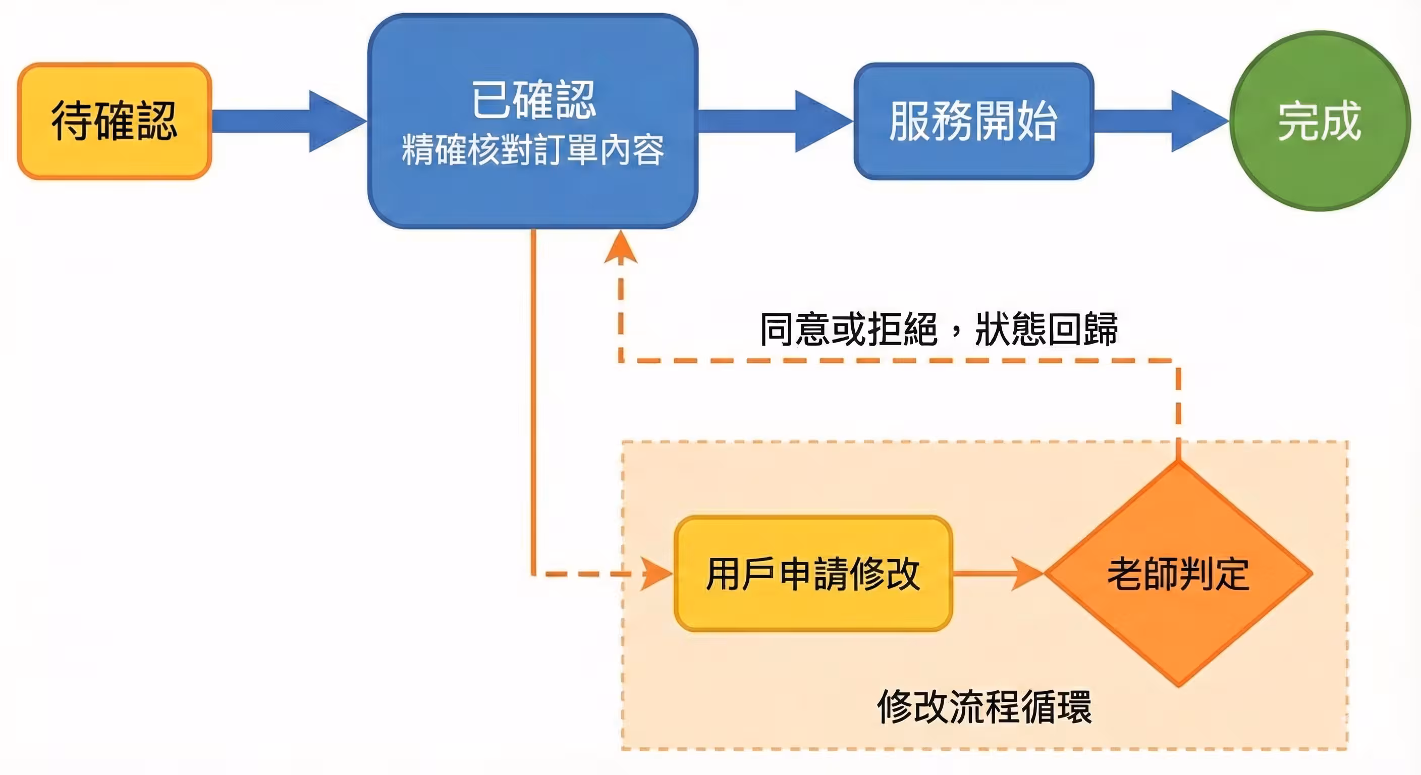 若倒數時間結束還尚未同意則自動取消修改,返回訂單[已確認]狀態,以訂單原本時間為主。 - 已確認:老師確認接單後的狀態。此時用戶端無法取消。